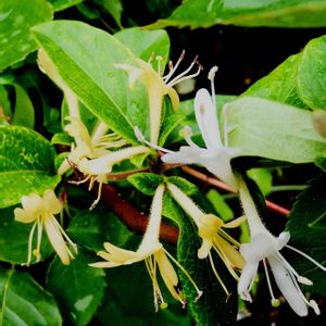 スイカズラの黄変 小さな庭のスイカズラ(金銀花)の花です。 一昨日開花分が黄変してきました。 スイカズラは、金銀花の名の通り、最初は白花(銀)、2、3日後に黄花(金)色に変色します。
