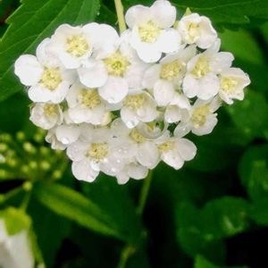 コデマリの一番花 小さな庭のコデマリの一番花が咲きました。 そぼ降る雨にもめげずに、、、
