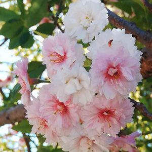 小さな花径の八重桜です。 白がメインの花とピンクがメインの花が混在しています。 ググって見るとフユザクラの八重のような、、、