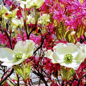 ハナミズキとトキワマンサクの饗宴 小さな庭でハナミズキとトキワマンサクの饗宴です。