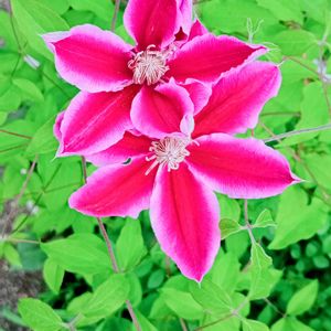 小さな庭のクレマチス クレマチスが鮮やかな緋色で、咲きました。 冬場に、枯れた様な枝になるため、取り除いていたのですが、大間違いで、枯れた様な枝から、新しい芽が、、、 別名、テッセンと呼ばれる所以かも、、、