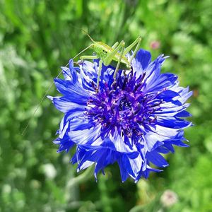 矢車草にバッタ君 食べたらダメですよ