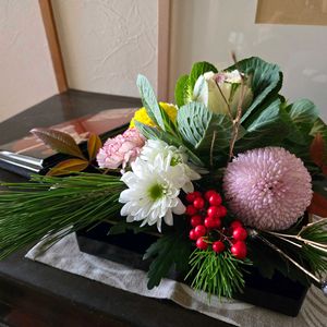 お正月のお花 今年最後のお花のお稽古でした🌼 例年は、水引や稲穂等も飾るのですが、今回はシンプルにお花だけ…🙆 お花の名前が知りたくて、お世話になり始めたGS。「今日のお花」だけ見て終わる日々でした😝 数枚の投稿に「いいね」して下さった皆様、どうも有り難うございました🙇♀ 良いお年を🎍