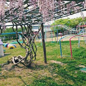 娘たちが通う幼稚園の藤の花( ´。•᎑•。` ) 今年で閉園なので、この花も見納め( p′︵‵。)