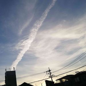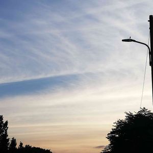 朝焼けの後に飛行機雲❓にしてはかなり太くって東の空~西の空をまたがって見えました。とても不思議な雲と出会いました😅