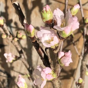 🌸啓翁桜(ケイオウザクラ)🌸3/20「仲よし小道」 切り花でよく見る桜が木の幹から生えて咲いてました💕 小さめのお花だけど、淡い色で中央が少しずつ濃いピンク色のグラデーションが可愛い😍 このお花が、お正月頃お花屋さんに並び出すと、一足早く春を感じ始めます🥰