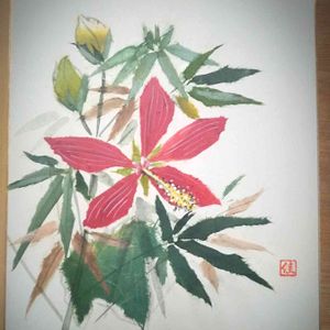 モミジアオイ❤️(和紙貼り絵) 昔、畑をしていた頃に作っていました。 それをスケッチして仕上げました。🤗