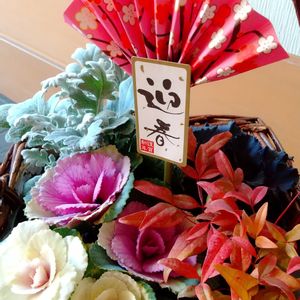 あけましておめでとうございます🎍 今日は新年に相応しい清々しいお天気☀️ 身が引き締まる思いです🤭 このところ…少しGSからご無沙汰でしたので 元日の投稿ができてうれしいです☺️ 今年もどうぞよろしくお願い申し上げます🧛 今日のお花☘️南天☘️と ☘️葉牡丹☘️シロタエギク☘️の迎春寄せ🎍