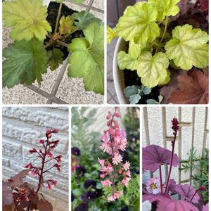 わが家のヒューケラたち🌿 左上→先日お迎え 右上→一昨年花壇に寄せ植えしていましたが瀕死の状態、、からなんとか復活✨ 下段3つ→昨年お迎えして今はお花が上がってきました♪ いろんな色があってどれも欲しくなっちゃいます☺️