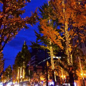 御堂筋のイチョウのイルミネーション(ブルーの区間)全長4kmで区間によってピンク、ブルー、ホワイト、イエロー、パープルなど色が違っています。