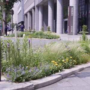 今日は仕事ついでに、この春 御堂筋の一角にできたナチュラリスティックガーデン 「平野町街園」 を見てきました。 吉谷桂子さんの東京青山通りのまちニワや熊本市のゆるっとナガーデナーズさんの歩道花壇に憧れネットで舐めるように見てきた私にとって、近くにこんなスポットができた事がメチャ嬉しくて♡ 植栽も参考にしたくて、いっぱい写真撮ってきました♪ でも画像を見てみると、宿根草とグラス中心の花壇は華やかさに欠けるところもあり、一般受けするのは難しいかも。(私は好きですが(//∇//)♡) でもこういう雰囲気が好きな方がGS内にいらっしゃると信じて投稿してみます! 今は黄色いノコギリソウが満開で、エキナセアやリアトリスが咲きはじめたところ。真夏はルドベキアなども咲いてもう少し華やかになりそうなので、また来月も見に行ってみたいと思います。一年間の変化を楽しむのがナチュラリスティックガーデンだと思うので、そのうちみどりのまとめも作るかも。(^^)