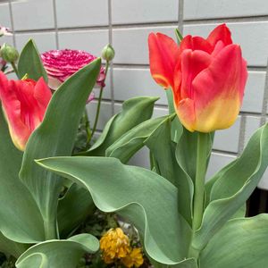 自宅にて〜 2色咲き🌷「マッチ」 4球根植えて 🌷🌷🌷🌷咲き揃いましたぁ ラナンキュラス 花かんざし アリッサムの寄せ植えに 🌷忍び込ませたのですが 手前に🌷🌷🌷🌷一列🤣💦 ラナンキュラス 見えません…… 上から見れば 窮屈そうに 居ますう 4月11日 撮影