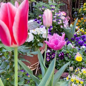 寄植えに色んな種類を埋め込んでおいたデッカー植えのチューリップです 毎年思うけど葉っぱが大きくなっちゃうんですよね🤣