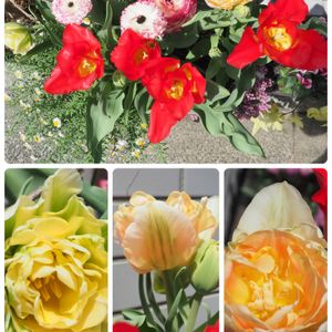 自宅にて〜 ひとつ前に投稿の寄せ植えに 枝咲きチューリップ 「チャーミングレディ」も💛💛💛3球根 植えてますぅ めっちゃ窮屈そう……🤣💦 🌷なのに枝咲き〜 去年 GSで 皆さんの投稿で知り 可愛いと思い 球根を購入 八重咲きで 丸みのあるお花 中は🧡 かわいい🤗 4月13日 撮影