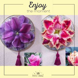 Enjoy the moment 「今を楽しもう」 「その瞬間を楽しもう」 花遊び💐楽しみました💓 先日チューリップ🌷の花びらで作った 壁掛け(右)だいぶドライになって 小さくなったので また作り変えました🌷🌷 今日も穏やかな一日になりますように♥️