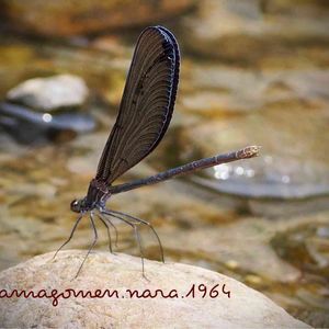 奈良・佐保川散策(羽黒蜻蛉・雌♀) 雄同士が必死で攻撃し合っているのを じっと見つめている雌の羽黒蜻蛉ちゃん 子孫を残そうとする雄も大変だぁ~ ( ˘ ˘).。o