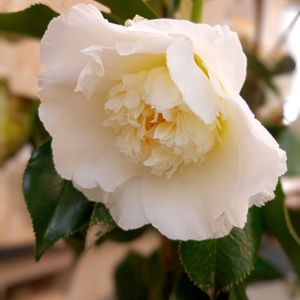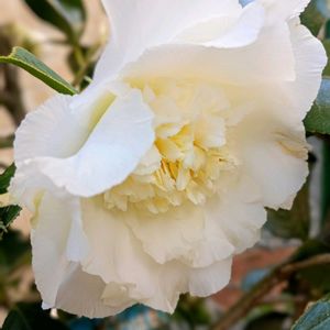 椿、エレガンスシャンペンも開花🤍🍾🌿 🔍【🖊米国で作出されたヤブツバキ系園芸交配品種エレガンス・スプレンダーの枝変わり。花は中心がクリーム色になる白色で牡丹~唐子咲きの華やかな大輪を咲かせます】…とのことですが、今年は蕊の黄色を見せて咲いているものも🤭❓ 🔍【三大エレガンス系のひとつで 『エレガンス シャンパン』 『エレガンス シュープリーム』 『エレガンス スプレンダー』を三大美花と呼ばれています】 ひらひらドレス👗のフリルの様な花びら 目一杯に開花すると1輪が7~8cmにもなるので 裏庭を覗けば👀❣️目を引きます🥰 4年目(?)驚く程の蕾数の今年ですが、樹高は40cm程なので 全部咲かせていいものかは悩みどころですが…😅 地元森林組合産で400円くらいだった記憶😊 エレガンスシャンペンらしい花姿はまたタグ🏷から見て頂ければ🍀🤗💞