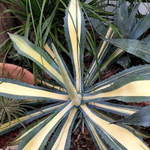 アガベ・アメリカーナ・中斑(縞斑からの進化バージョン) なので同じ中斑でも那智の輝と違い大きくなります 残念ながら今のところお子様はライン太めの縞斑😢 固定、出来たら覆輪よりインパクトあるんだけどな🤔