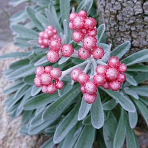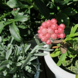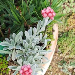小さくて丸いピンクの花が咲きます。 琥珀さんにヘリクリサムルビークラスターと教えて頂きました🎵😄