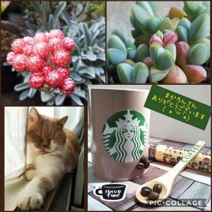 実はもう一つプレ企画で当たっておりまして🎯···何かスミマセン ↘️まかろんさんのコーヒーリメ缶と豆付きスプーン☕(ノ*>∀<)ノ♡ と~っても素敵です😤😤 コーヒービートと信玄餅味のカントリーマアムも頂いちゃいました♪♪ まかろんさん、ありがとうございます(๑˘ ³˘๑)チュ~♡ ↖️ヘリクリサム ルビークラスターがちょっと咲いてきました✨ ↗️今日はトトの日🐟 冬の色が抜けきらないウチのトト ↙️豆吉ฅ•ω•ฅ招き猫ポーズ コーヒー豆を招いたのは自分だと主張 豆だし・・・・・