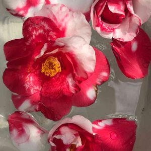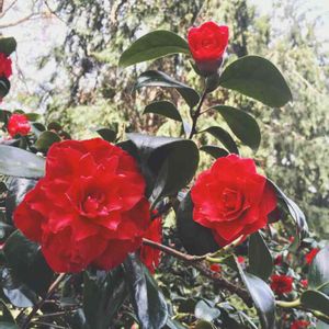 おはようございます。 今朝は赤椿です。 ひとつの木に、色々な形のお花を つけるので面白いですね。 花弁の形が丸かったり、とがっていたり。 葉も大きくて艶やか。好きなお花です。 気温変化で体調崩しやすいですね。 みなさま、お気をつけてください♡