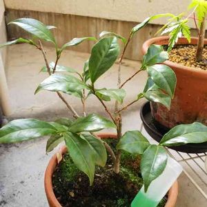 金魚葉椿 白 小さく仕立てたいな😊 もう少ししたら金魚を外に出すから 葉を睡蓮鉢に浮かべて一緒に撮りたい♪ 睡蓮鉢手に入れるために仕事頑張らねば💪