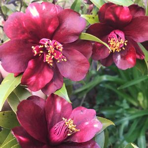 洋種ツバキ ハネムーン アメリカで作られた品種で片親は中国原産の金花茶 金花茶交配種は寒さに弱いので冬季は室内管理しないといけないが本種は徐々に寒さにならせば地植え出来ます 接ぎ木して8年物で今年は100輪を越える花を付けてくれました