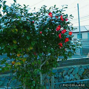 朝から雪のち雨☃️❄️☔️ 庭の椿が咲いてたわ😊💕 雨粒が付いて綺麗✨✨