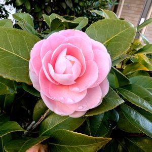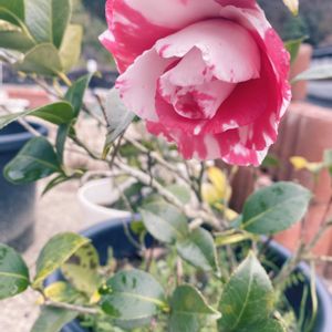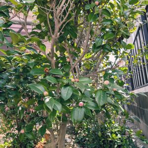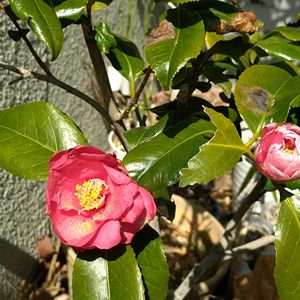 ツバキ 桃太郎 1️⃣名前が気に入って、細い苗木を植えて20年 毎年、自己流強剪定を繰り返すが、さすが桃太郎さん。 強すぎて手に負えなくなっている。 花は直径12cmくらい。 2️⃣目の高さで、枝が横に広がるように育って欲しいが、ツバキの特性で無理かなぁ😂