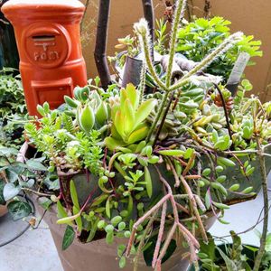 ブリキ鉢の多肉寄せ 気温、上昇🍀色もさめて徒長ぎみに… 火祭り、緑になってる