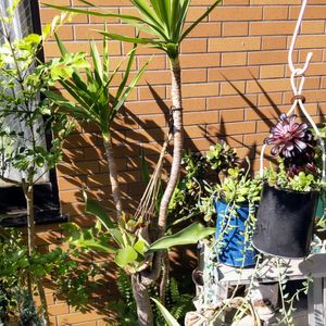 今日のお花 ユッカ🪴朝日がまぶしい もう20年以上は過ぎて、3本仕立て🌿 下の葉から剥いで、スッキリさせてコウモリランを下げたり 周りには、多肉やパイン🍍を置いてます🎶🪴