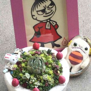 こんにちは〜(*´▽`)ノノ 🏷ムーミンの日🎶✨参加させていただきます🙋♀️ かわいいムーミン達がたくさん見れて楽しい(≧∇≦)🎶 月の雫ちゃんにいただいたちゃんちゃかミーで参加🎶 ついでに(🤣🤣🤣)チモッケだったかな??も一緒に 📛忘れちゃった💦💦💦😅 先日ちまり直した、にゃん太さんのcake鉢で🎂 風が酷く吹いて雨も少し降り出した⛈🌪⛈ 家🏠飛んでったら困る〜!!( ˘•ω•˘ ).。oஇ