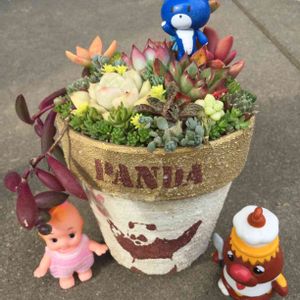 おはようございます☀️ 今朝のお気に入りさん💕✨🎶💕🍀 ラブリーなスナイパー(?)🐼のイラストがかわいい鉢🎶💕 多肉ちゃんに目覚めてすぐの頃… 作家さんとか…リメ鉢とか…箱庭とか…知らない時 イベントデビュー🤣💦初参戦した日(๑•̀д•́ฅ🏆✧ 超カルチャーショック!!🤣(*゚0゚*)スッゴッイ!刺激を受けた🎶 その日にgetした リメ鉢の1つ (はい😅爆買いの歴史の始まりでもある🤣🤣🤣) やっぱり周りのセダムがワサワサ伸びてたから ✂️&寄せ直ししました🌱🍀✨ 植物の育ちを考慮し屋外管理🍀✨🌱✨🎶