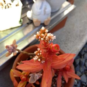 おはようございます😊(*^^*) 名前が、分から無かった 多肉さん。 なんと、小さな白い花の 蕾が、咲きました🌸 これから、紅葉🍁するとか? 楽しみ😊(((o(*゚▽゚*)o)))✨