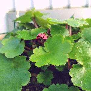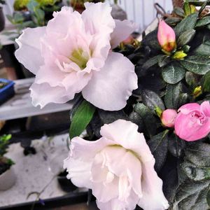 秋田県鹿角郡、涼しい朝8時です。 八重白鳥花盆栽の根上がり部分から出た新芽に、植物の生命力を感じます。