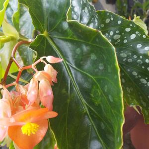GSの花ともさんにいただいた、木立ベゴニア🥰 オレンジの株の花が咲いてからずいぶん遅れましたが、ピンクも咲いてきました*.(๓´͈ ˘ `͈๓).* まだ、株は小さいですが、水玉の葉っぱが生き生きと元気です٩(๑❛ ❛๑)۶