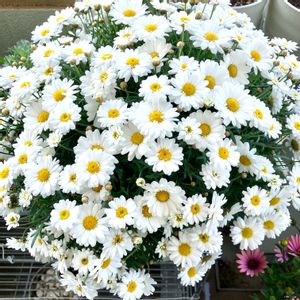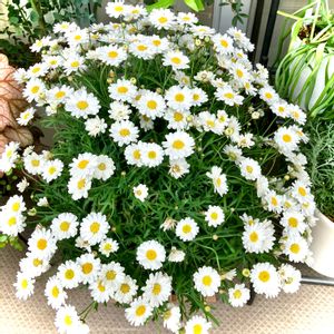 PWマーガレット ホワイトモカ 10月5日(水)にお迎えしました 前回の投稿が2月8日(水) 開花してから今日で6日目😃 2日続けて15度以上に気温を記録した名古屋🥵 もお~3月なみの気温じゃん🎶 お日様にガンガン当ててあげました🌅 我が家では4鉢のマーガレットを育ててますが この子は一番生育が旺盛です😃 まともに蕾も上がってこない子がいるけど😓 この子は一足早く咲き揃いそうです😃🎵