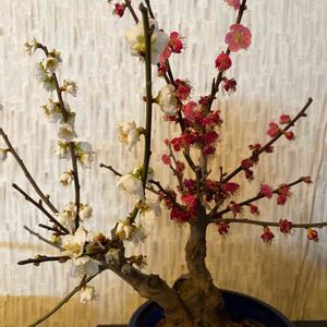八重の紅梅 咲き始めた。 去年白を買ったので 今年は紅を必ず買うぞと 心に決めていて 年明け 小さい紅梅盆栽を見つけた。 ①紅白そろい踏みで。 ②紅梅咲いたよ。 能登地方で被災された方 GSの皆様 世界のみんなに 捧げます🥰