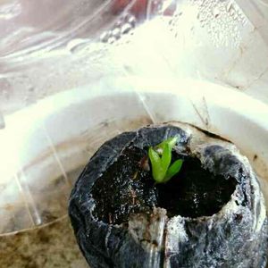 実生ハオちゃん。 こんな感じで、ペットボトルを かぶって生活しています。 プチ温室だもんね~\(^o^)/ もう少し大きくなってから植え替えかな❔❔❔
