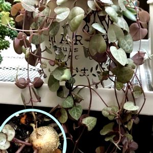 ❤️ハートカズラ❤️ 葉っぱのハート型がキュート💓 葉の裏は、赤紫 冬の寒さには弱いけど この子は比較的育てやすい子 ガガイモ科というだけあって ムカゴが大きくなって来た〜 ムカゴから根っこと茎が数本出てる ムカゴを植え付けたら 容易に増やす事ができるらしい もうちょっとモリモリになって欲しいなぁ🤗