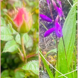 おはようございます。 良い休日をお過ごしください。 昨日は一日中雨☔ 夕方から雨足が弱くなり曇天へ☁️ 雨上がりの花を撮りました。 蕾が出かけ始めた薔薇🌹とシランです💜 いつもありがとうございます🙇♀️