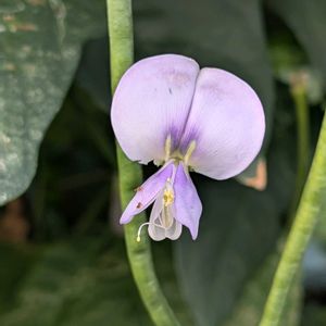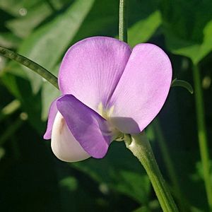 ササゲ (十六ササゲ、三尺ササゲ) まだまだマメ科🟣 離れの日除けに植えているササゲは、期待通りにぐんぐん育った🟩 同じくササゲ属のヤブツルアズキはアズキと同じ黄色い花だけれど、こちらはダイズに似た色合いで、左右対称🟣 紫色の大きな蝶形花はすぐに長い鞘になって、食卓を彩ることになる🟢 関東では、赤飯を炊く時には、小豆の代わりに腹割れのしないササゲの豆を使うとか♬ ツルはマメ科なので右肩上がりのZ巻きです↗