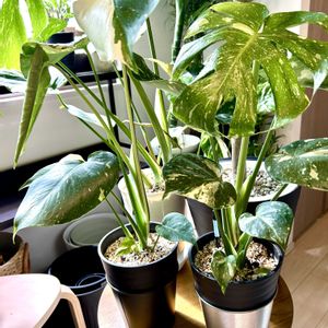 斑入りモンステラ3鉢鉢増しした😊セラアート5号😊大きくなーれ モンステラタイコンストレーション🇹🇭 モンステラホワイトタイガーハーフムーンポルシギアナ🐯 斑入りモンステラ(バリエガータ)の主な人気品種をご紹介します。 🌿 白い斑(白斑)が入る系統 この系統は、深い緑と純白のコントラストが非常に美しいのが特徴ですが、白い部分は光合成能力が低いため、通常の緑葉のものよりデリケートな管理が必要です。 • ボルシギアナ・アルボ・バリエガータ(通称:ホワイトタイガー) • 特徴:深い緑の葉に、ペンキを散らしたような純白の斑が不規則に入ります。 • 分類:ボルシギアナ系のため、茎は細く、つる性の性質が強い傾向があります。 • 注意点:斑の入り方が不安定になりやすく、育成難易度はやや高めです。 • デリシオーサ・アルボ • 特徴:デリシオーサ(太い幹、大きな葉)の変異種で、純白の斑が入ります。 • 分類:ボルシギアナ系よりも葉が大きく、より肉厚な傾向があります。 • ホワイトモンスター(テンシンラン) • 特徴:広範囲にわたり白やクリーム色の斑が強く入り、時には葉全体がほぼ真っ白になる部分が現れることもあります。 🌟 黄色・クリーム色の斑(黄斑・散斑)が入る系統 この系統は、黄色やクリーム色の斑が入り、白斑の品種と比べて斑が安定しやすい傾向があります。 • タイコンステレーション(通称:タイコン) • 特徴:葉全体にクリーム色や黄みがかった斑が、まるで星を散りばめたように細かく入ります。 • 流通:タイで組織培養により作出された品種で、斑が安定しているため非常に人気があります。 • 分類:デリシオーサ系の特徴を持つことが多いです。 • デリシオーサ・オーレア(通称:イエローモンスター) • 特徴:鮮やかな黄金色や黄色の斑が、大理石のようなマーブル模様を描き出すのが特徴です。 • イエローマリリン • 特徴:濃い緑の葉に、明るい黄色やクリーム色の不規則な斑が入り、鮮やかなコントラストを楽しめます。 斑入りのモンステラは、どの品種も通常のモンステラよりも葉焼けしやすく、また**暗すぎると斑が消える(先祖返り)**ことがあるため、管理には特に注意が必要です。