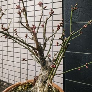 ☀今朝の紅梅小鉢🎍 随分ふっくらしてきた蕾たち、花びら見えてきたのもあります。 咲き始めは来週末くらい?