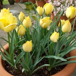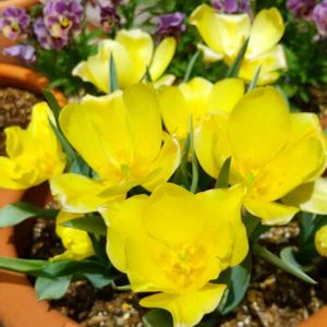 おはようございま~す☺️ ☂️予報の今朝は…どんより 曇り☁️かろうじて… いつ☂️が降ってもおかしくない空です😅 picはよく晴れていた昨日の小さな庭です🖐️ 今年で3年目となる 鉢に植えっぱなしの🌷チューリップが 今年もたくさんの花を付け 乱れ咲きです😁 花は小さくなりましたが😯 お日さまに向かって咲く姿… イエローバワーに元気もらいます🤗
