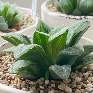 おはよう御座います 台風🌀来てるけど 凄く天気がいい朝です✌️ 写真の子は ハオルチア 旧氷砂糖さん💕 久々の登場🤗 う〜ん いい感じで色が 暴れてますね〜😁 白・薄みどり・みどり ギリギリの所で色が安定してます❣️ 白が多すぎると⭐️になるので 日光があたる位置をこまめに 変えて調整してま〜す💦 朝から癒されちゃいました🙆♀️ 今日も一日頑張りま〜す👋