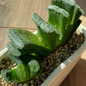連投で〜す✌️ 写真の子は ハオルチア 旧氷砂糖さん💕 水やりのたびにぐんぐん大きく なってます💪 白と緑の割合も6:4位で白が 多めでいい感じです🤗 葉も開いてきて花みたい🌼 太陽シャワーで☀️ キラ✨キラ✨で〜す✌️ 今日の午前中は町内の行事で お出掛けで〜す😱