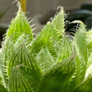 連投で〜す✌️ 写真の子は ハオルチア 羽衣さんです💕 モフモフ✨ケバケバ✨ で可愛い子で〜す👩 葉先のチョロリンっとした先が うっすらピンクで👍 見ていて飽きないハオさんです🙆♀️ 風は強いけど 本日の多肉活動開始しま〜す🤚
