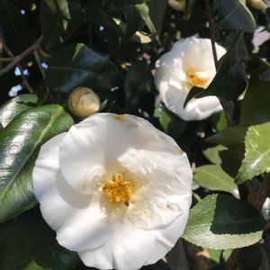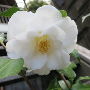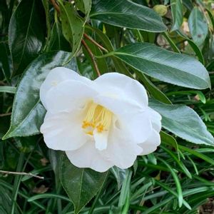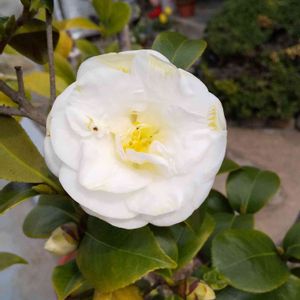 こんにちは😃 真っ白な大輪の椿に出会いました。 多分、白羽衣かと、思います。 とても美しい椿です。