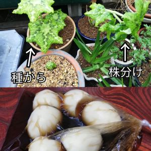 上 根を 切り分けて 株分けしたもの 下 種から 芽を出したもの